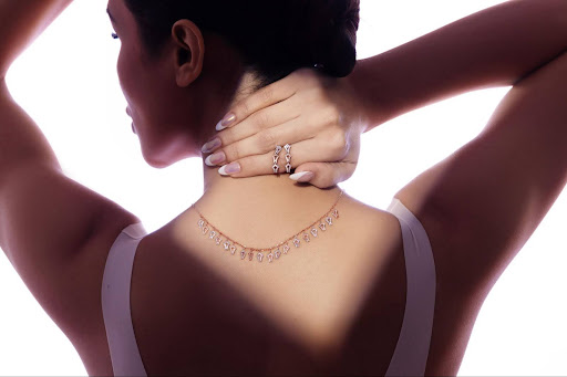 The Astra Prism Set is a radiant display of geometry and grace. Featuring a delicate back-drop necklace adorned with angular prism-cut diamond motifs, each framed in rose gold, it’s a celebration of light and silhouette. Paired with a matching open band ring echoing the same prism elements, this duo feels modern, sculptural, and striking – even from the back.