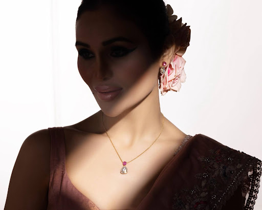 Where romance meets regalia — the Gulroz Heart Set features a bold rose-cut heart-shaped polki framed in delicate gold, topped with a luscious deep pink gemstone. The coordinating earrings mirror this soft yet striking design, blending heritage aesthetics with a touch of modern drama.