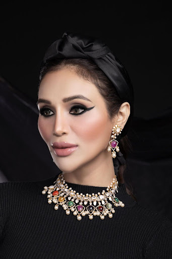 A revival of royal grandeur, the Navya Navratna Set features a bold kundan choker embellished with the nine sacred gemstones of Vedic tradition — ruby, emerald, sapphire, pearl, coral, topaz, diamond, cat’s eye, and garnet — all nestled in intricately crafted gold and crowned with pearls. The matching earrings echo the same celestial harmony, blending age-old wisdom with timeless beauty.